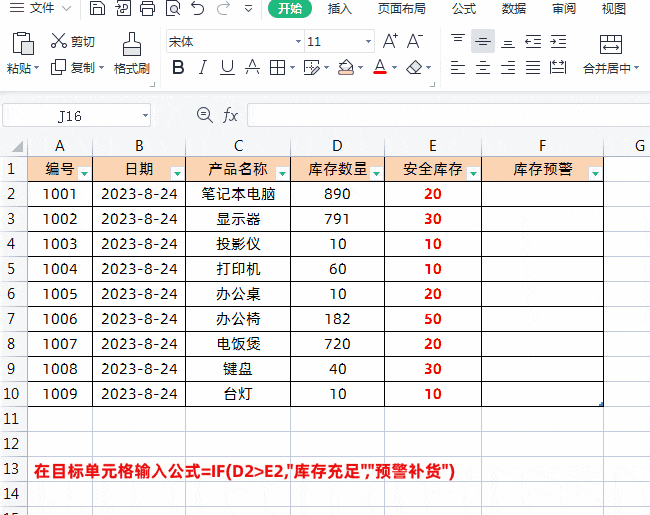 利用IF函数判断D2单元格的库存数量是否超过E2的安全库存,若超过则显示库存充足,否则提示预警补货。