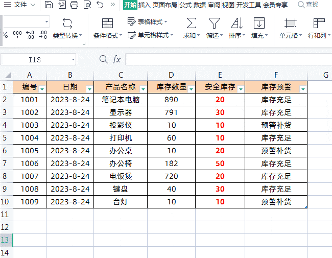 向下填充数据,即可得到库存预警状态信息