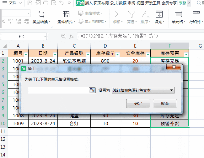 在等于对话框中输入预警补货,设定填充颜色后,点击完成操作。