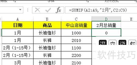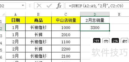 若要计算2月的总销量,可输入公式:=SUMIF(A2:A9,2月,C2:C9),然后按回车键,即可得出结果。