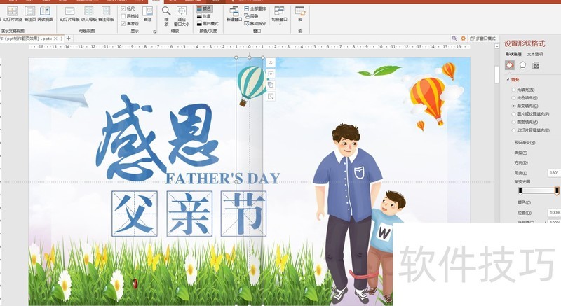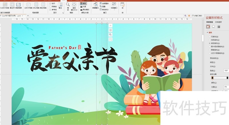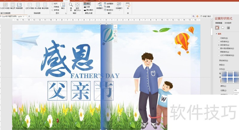 右键选择设置形状格式,在形状选项中启用渐变填充,将矩形边框设为无轮廓。选中第一个渐变光圈,设置为线性向左,颜色为黑色,位置0%,透明度90%;第二个光圈同样设为黑色,位置100%,透明度100%,方向也为线性向左。完成后,将该矩形复制到每一页相应位置。