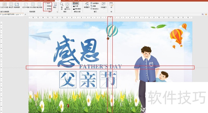 先点击视图,勾选标尺与参考线,开启辅助功能,定位页面中线,于中线处插入无边框矩形。