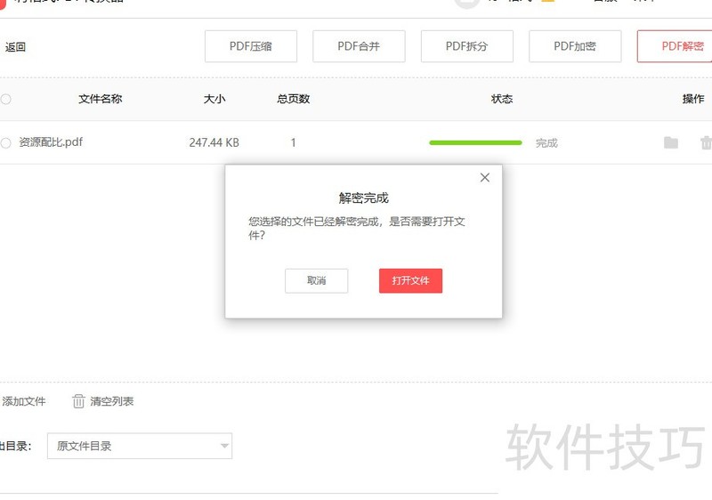 解密操作很简单,选择功能,上传需解密的文件,点击,输入密码即可轻松移除文件保护。