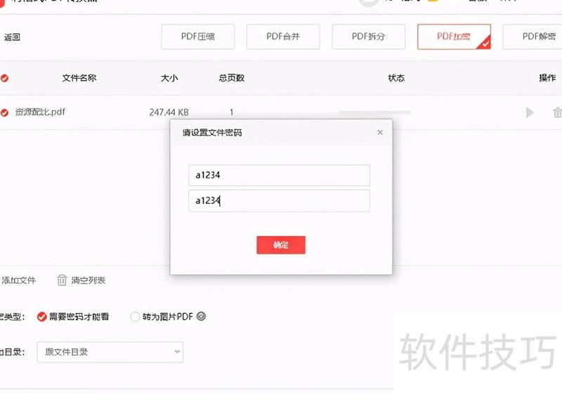 首页提供功能,上传需加密的PDF文件后,点击,设置一个便于记忆的密码并确认,即可完成加密操作。整个过程简单快捷,无需复杂步骤,安全高效地保护你的文档内容。
