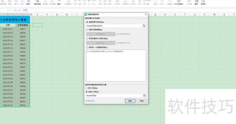 4.3 在弹出的创建数据透视表对话框中,于底部请选择放置数据透视表的位置处选择现有工作表,用鼠标点击原数据表中的任意空白单元格,然后单击确定按钮完成操作。