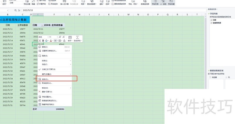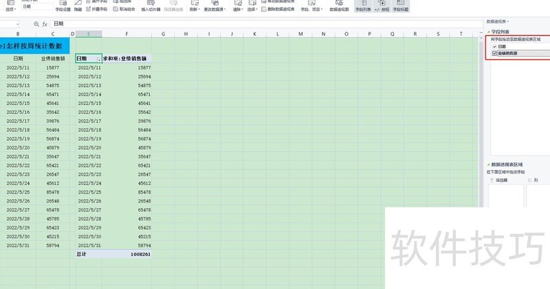 5.4、此时表格右侧将显示数据透视表设置,勾选字段列表中的日期与业绩销售额。