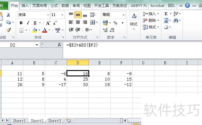 (二)利用ABS函数计算绝对值。例如,在D2单元格输入公式=$E2+ABS($F2),通过取绝对值将负数转为正数,实现相当于减去负数等于加正数的效果。
