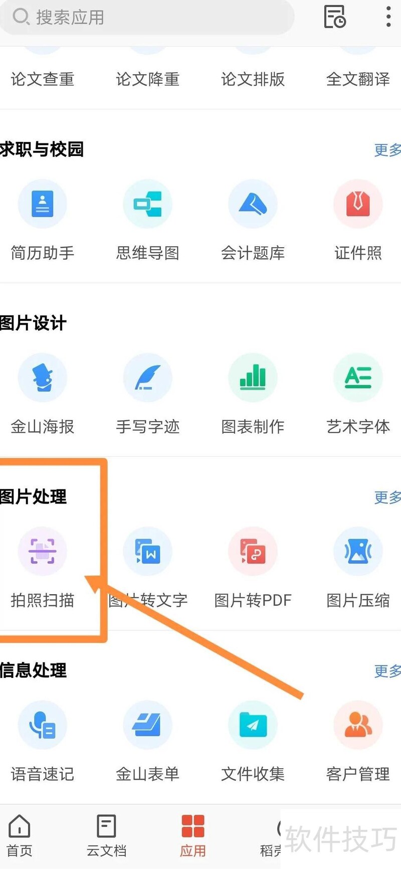 进入应用后,滑动屏幕找到图片处理,点击进入并选择拍照扫描功能,具体操作所示。