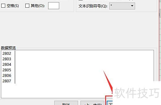3、点击分列按钮,在弹出的对话框中核对数据无误后,点击下一步(所示)。