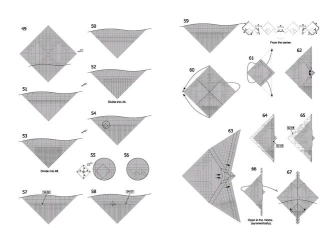 现在,将四个角向中心点折,形成一个菱形,然后,将模型翻到背面,把左右两边向中间折,对齐中线,接着,将上方的角向下折,形成鲨鱼的背部。