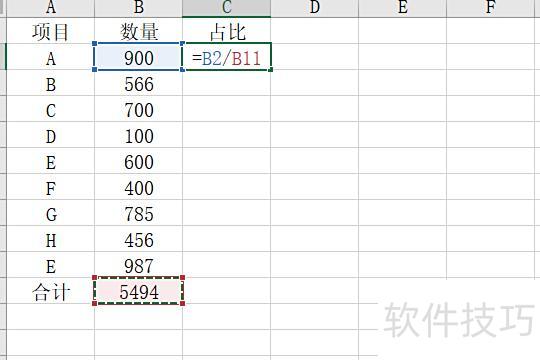 在C2单元格输入公式=B2/B11,用数量除以合计,计算占比。