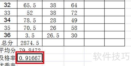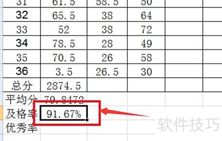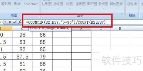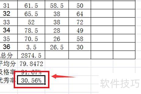 优秀率与及格率的计算方法类似,仅函数不同,其余操作相同。优秀率函数为:=COUNTIF(B2:B37,>=90)/COUNT(B2:B37)。