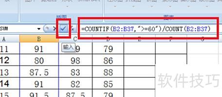 计算及格率的方法如下:以语文成绩为例,共有36名学生,成绩数据位于B列的B2至B37单元格。首先选中用于显示结果的单元格,然后在公式栏输入=COUNTIF(B2:B37,>=60)/COUNT(B2:B37),该公式用于统计B2到B37中成绩大于或等于60的人数占总人数的比例。输入完成后点击√确认,即可得出语文科目的及格率。