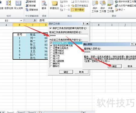 在弹出的保护工作表窗口中,输入取消保护的密码,点击确定,再次输入密码并确认,操作所示。