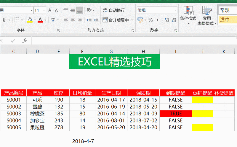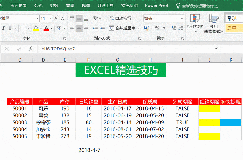 进一步扩展这个例子,仅靠保质期提前7天提醒并不足够,还需结合商品的日均销量。若根据当前销售速度,在保质期结束前无法售完库存,则应启动促销。可在条件格式中使用相应公式,将需促销的商品用黄色标记,以便及时处理临期库存。