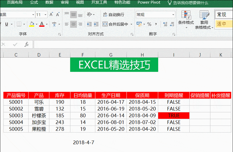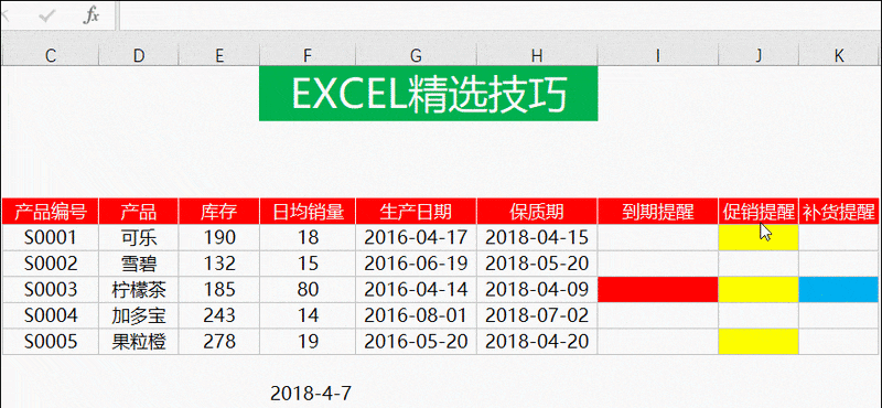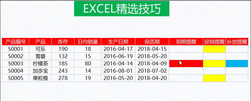 按照国际惯例,先看效果:Excel将根据保质期与当前日期自动进行颜色标注。