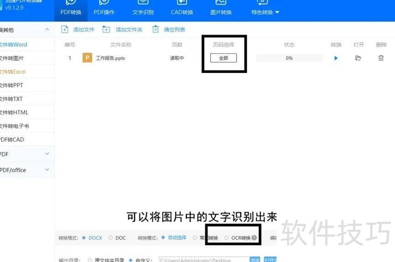 添加文件后,如需转换部分页面,可在页码处勾选;若需识别图片中的文字,请启用OCR转换功能,最后点击开始转换即可完成操作。