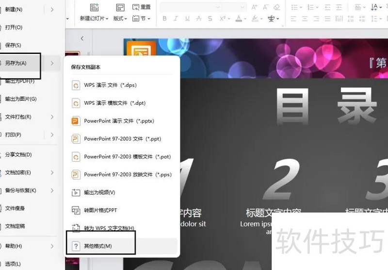 在PPT中点击文件选项卡,再选择另存为即可保存。