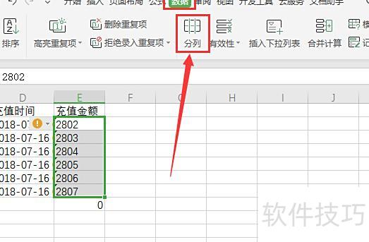 点击任务栏数据按钮,在数据页面中找到分列功能,具体位置见下图。