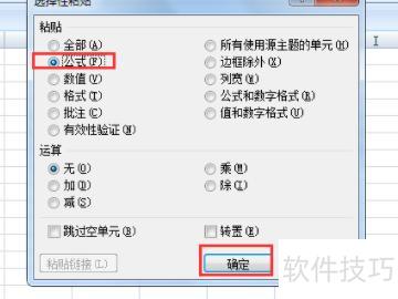打开选择性粘贴窗口,勾选公式选项后确认。