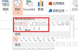 首先需安装PPT软件,打开后新建演示文稿,在插入菜单中选择形状工具,再从中选取直线选项进行绘制。