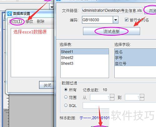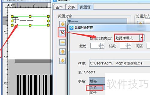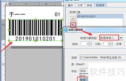 通过数据库导入功能将学生信息载入条码打印软件,学号即为考生条码数据。