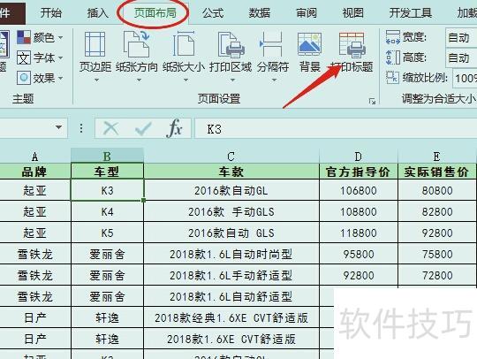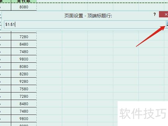 3、页面设置中将显示顶部标题行区域提示,选中表格首行标签后,点击对应按钮即可。