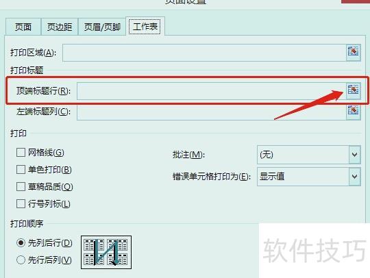 在页面设置界面中选择工作表,点击打印标题区域的顶部标题行按钮。