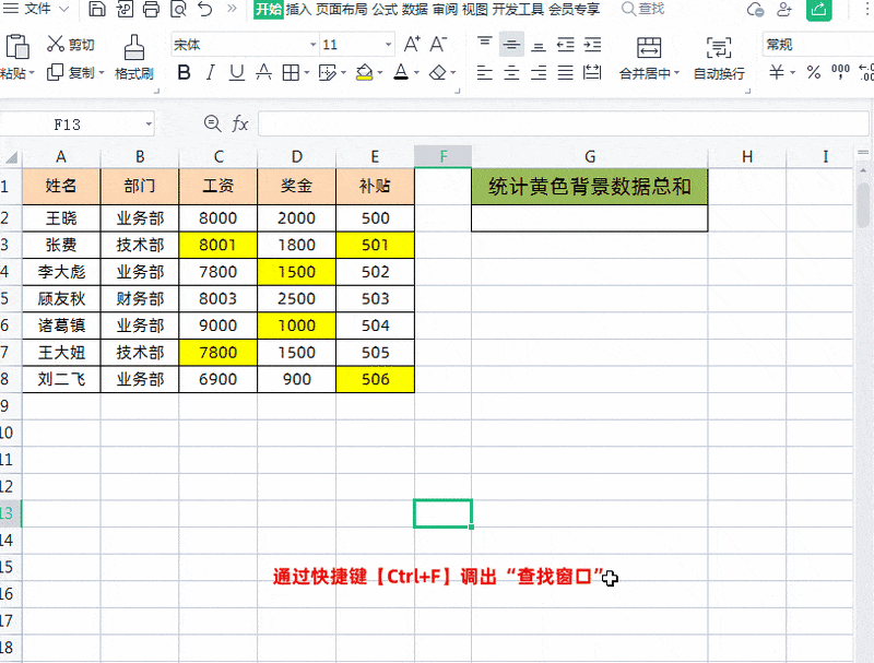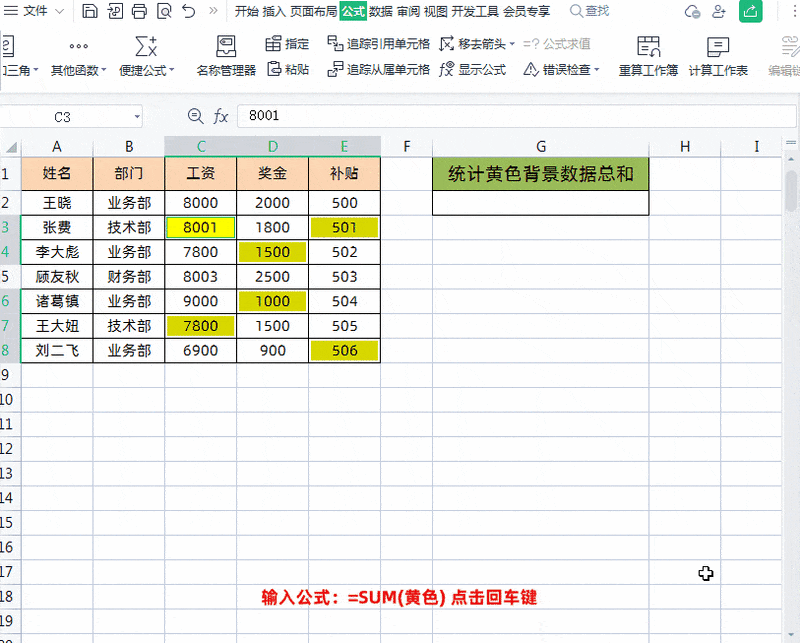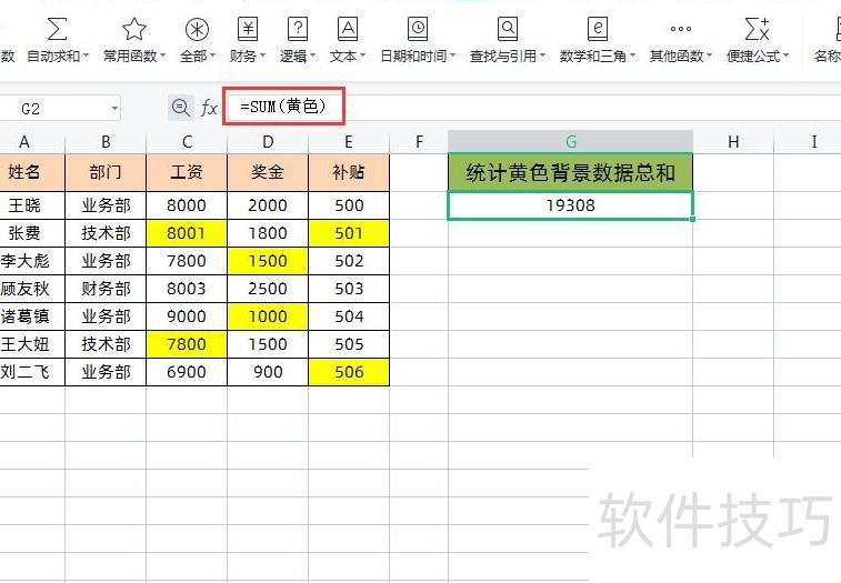 最后在目标单元格输入公式:=SUM(黄色),按回车键,即可计算出黄色区域数据的总和。