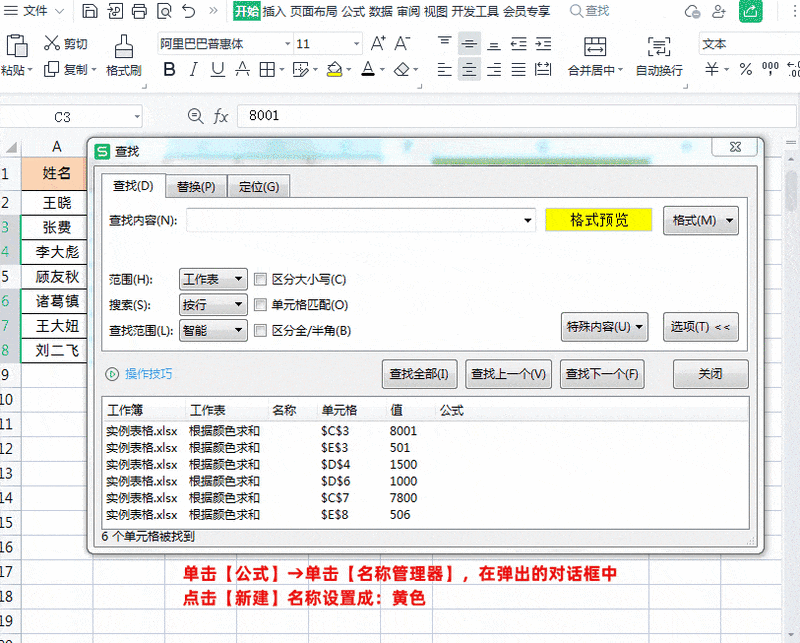 关闭查找窗口对话框,点击选项卡中的,新建名称并设为黄色,设置完成后关闭窗口即可。