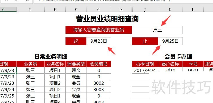 输入营业员姓名及日期范围,即可查询其在此期间的全部业绩记录。