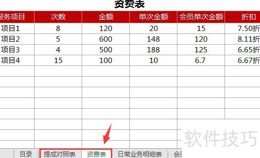这两张为基础表格,需填写基本信息,会员单次金额与折扣项目将自动生成。