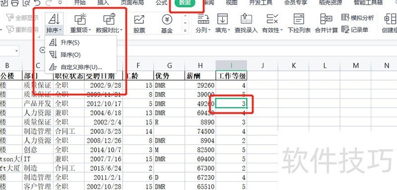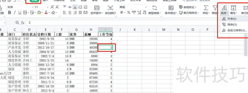 3. 操作命令:开始→排序→升序或降序;右键菜单→排序→升序或降序。步骤与注意:选定需排序的列,点击升序或降序按钮,整行记录将随之整体移动位置。