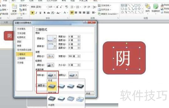 在文字效果格式中选择三维格式,将材质设为亚光。