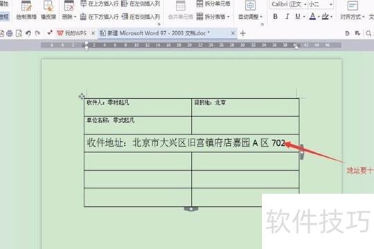 4、接着输入单位名称及收件人详细地址,地址应具体到单元号。若文本需换行,可将鼠标移至表格行中间,按住左键拖动以调整。