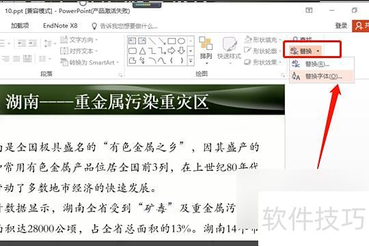 打开电脑中的PPT软件,加载一份演示文稿,将当前使用的统一替换为字体。