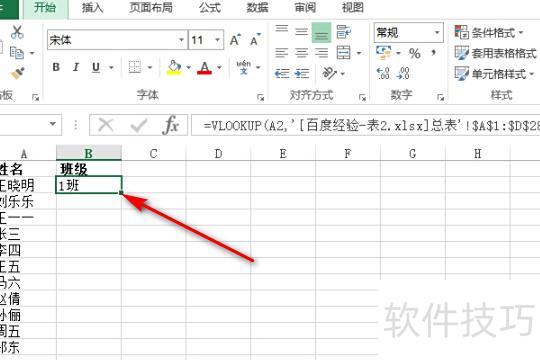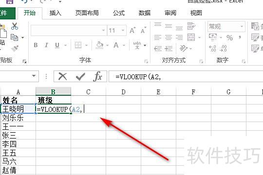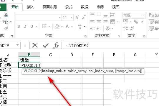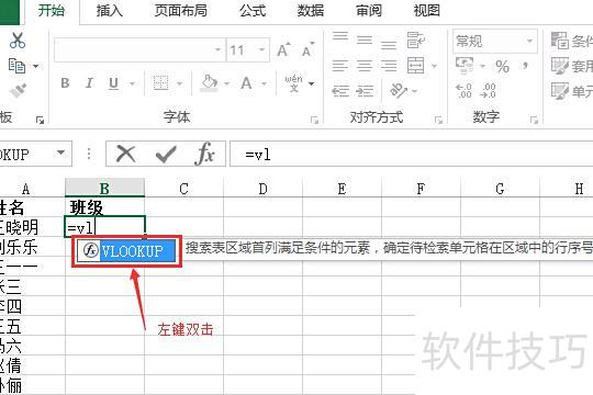 打开一个Excel表格,需从另一张表中匹配对应学生的班级信息。将光标置于目标单元格,在其中输入=vl,系统会自动提示VLOOKUP函数,双击蓝色函数名称即可插入该函数,随后按提示完成参数设置,实现数据匹配。