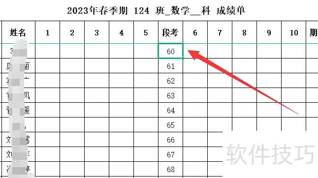 用鼠标点击编号1的段考成绩,将出现绿色边框。
