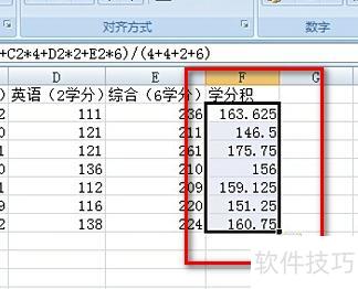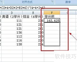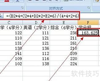 将光标移至第一行成绩末尾的空白处,在fx后输入=,接着输入学分绩计算公式:=(B2×4+C2×4+D2×2+E2×6)÷(4+4+2+6)。