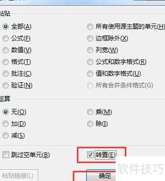 第三步,点击后会弹出选择性粘贴对话框,找到最下方的转置选项并选中,随后点击确定,至此全部操作完成。
