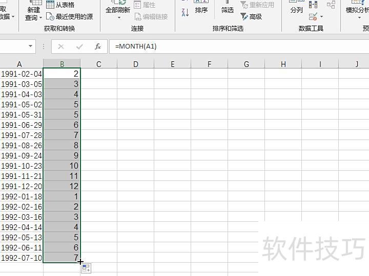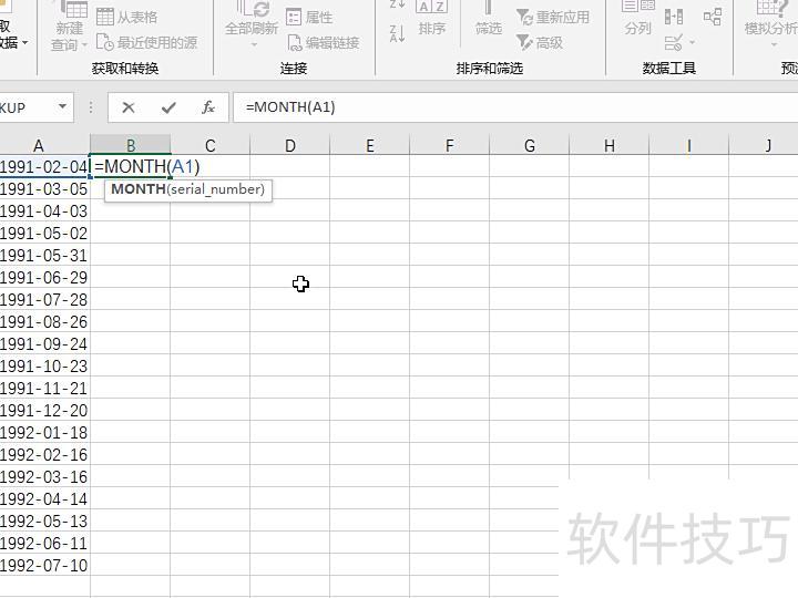 在B1单元格输入=MonTH(A1),用于提取A1单元格日期中的月份。