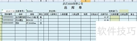 与入库单类似,在J4、K4、L4、M4中分别填写物料编码、名称、规格和计量单位。N4至S4已用于入库数据记录,出库单中应保持空白。T4、U4、V4分别填写出库均价、出库数量和出库金额。