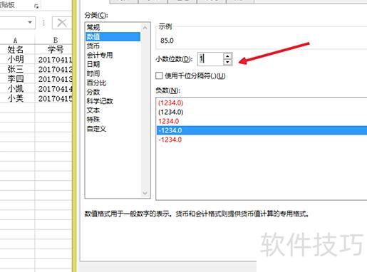 在Excel中,通过单元格格式对话框的数字选项卡,可设置数值的小数位数、千位分隔符及负数的显示方式。