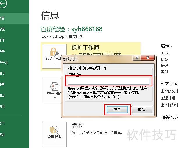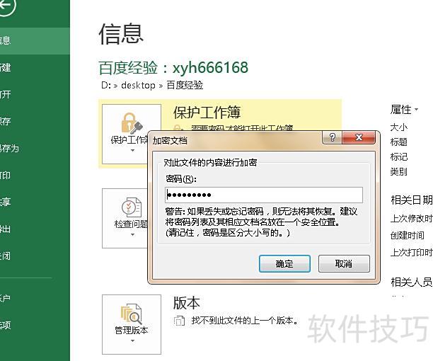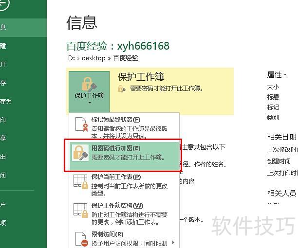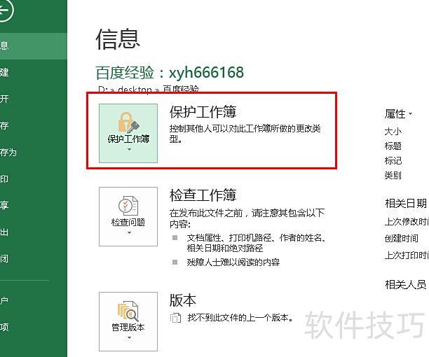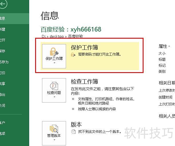 点击文件后,将显示的Excel设置界面,在保护工作簿处可见加密相关提示。