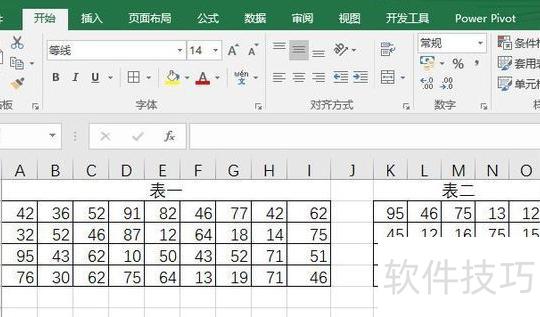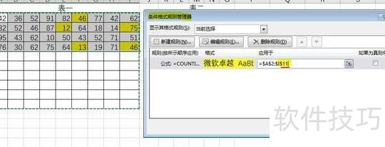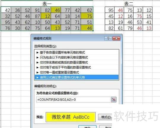 选中表一的数据区域,在开始选项卡的条件格式中选择新建规则,使用公式=COUNTIF($K2:$O2,A2)>0,设置填充颜色为黄色,点击确定完成设置。