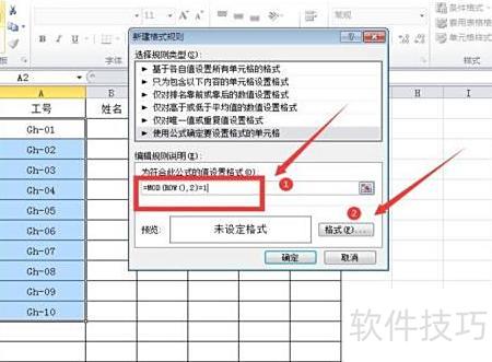 在新建规则窗口中,选择使用公式确定要设置格式的单元格,并在格式值文本框中输入公式:=MOD(ROW(),2)=1,该公式用于判断当前行行号除以2的余数是否为1。