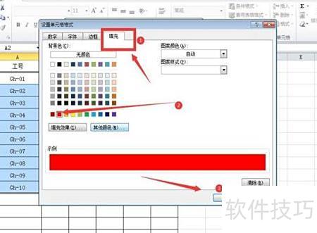 在设置单元格格式窗口中,选择填充选项,点击所需颜色后确认,操作所示。