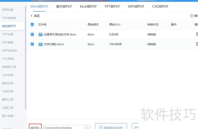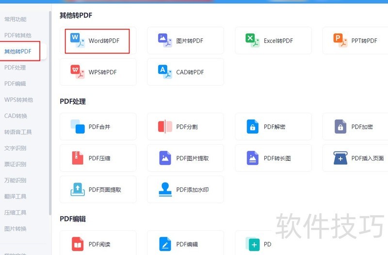 安装并启动软件,点击左侧工具栏的其他转PDF,选择Word转PDF功能即可。