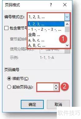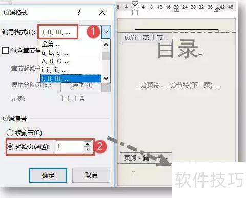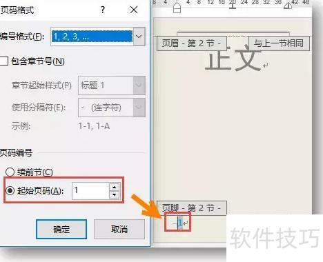 第三步:设置页码格式。打开对话框(操作方法见第2小节),将设为0,使第一页页码从0开始且不显示,从而实现第二页正文页码从1起始显示。