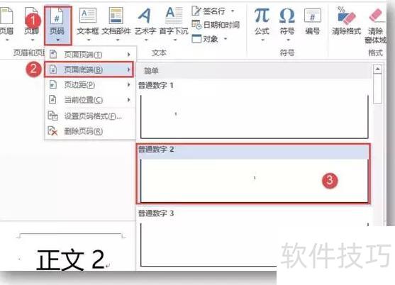 选中普通数字2后,Word将在页脚插入页码并进入页眉页脚编辑模式,用户可在此状态下继续调整页码格式与位置。